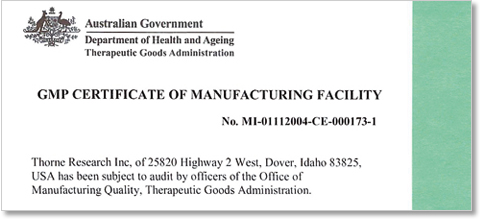 Thorne Research stellt sich freiwillig regelmäßigen TGA-Kontrollen und kann seit 2000 als einziger Hersteller von Nahrungsergänzungsmitteln in den USA ein TGA-Zertifikat vorweisen.